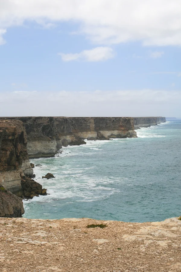 Ahead of us lay the Head of the Bight and The Nullarbor Plain. The Head of the Bight is one of the most spectacular whale watching sites in the world, with a cliff top boardwalk leading to a viewing platform. Although we weren’t visiting in whale season, we still enjoyed walking the boardwalk to see the magnificent cliffs and rugged coastline. Not much further along the road we refueled the car and grabbed some lunch at the Nullarbor Roadhouse, which also offers motel accommodation and camping facilities. Next we passed the sign for the beginning of The Nullarbor Plain, known as the treeless plain (‘nullus arbor’ loosely translated means ‘no trees’). The Nullarbor Plain, at it’s widest point, stretches about 1,100km from east to west across the border region between South Australia and Western Australia. It is well worth pulling in at the sign posted lookouts along the road for more breathtaking views. Each lookout is just a few minutes detour from the main road and did bring us welcome relief to see something different than the endless sealed road and monotonous landscape we had been travelling through. It was quite surreal standing at the top of the eighty metre high Bunda Cliffs and looking back across these sheer cliffs that line the Great Australian Bight, it really was spectacular.