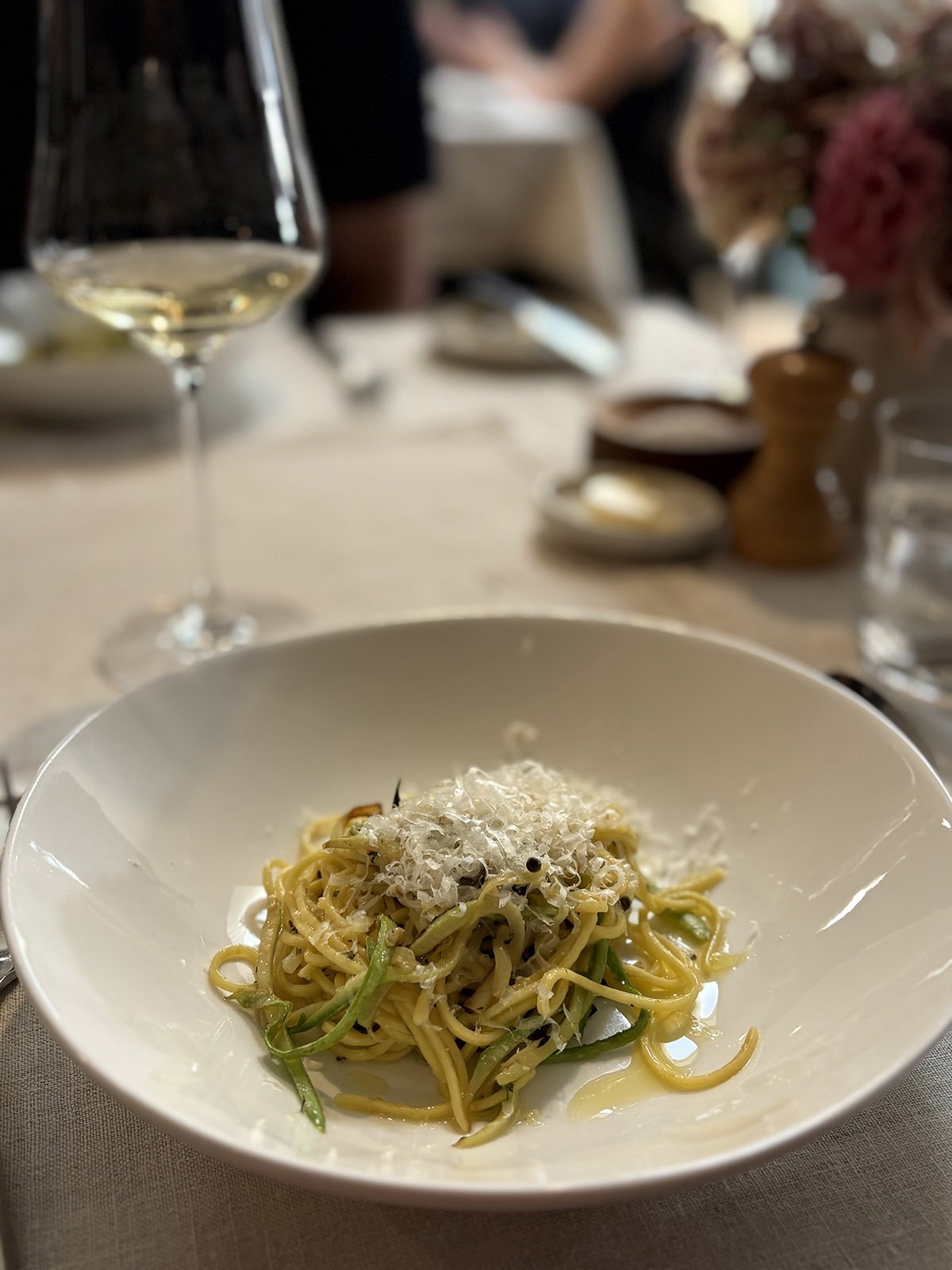 Duck egg spaghettini ~ Hand made spaghettini, zucchini, capers, winter savoury,
