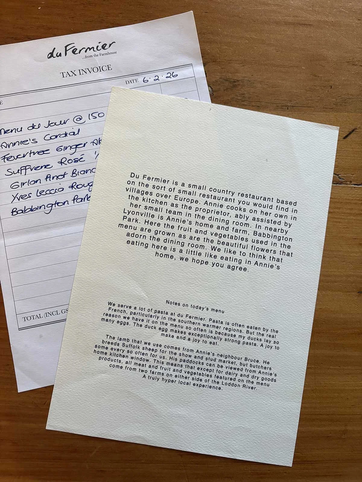 We started with a glass of Annie's Cordial and a Babbington Park Shrub* and then I had Bronwyn guide me on matching wines and Mr G stay with the shrubs. The notes on our menu read as follows; we serve a lot of pasta at du Fermier. Pasta is often eaten by the French, particularly in the southern warmer regions. But the real reason we have it on the menu so often is my ducks lay so many eggs. The duck egg makes exceptionally strong pasta. A joy to make and a joy to eat.